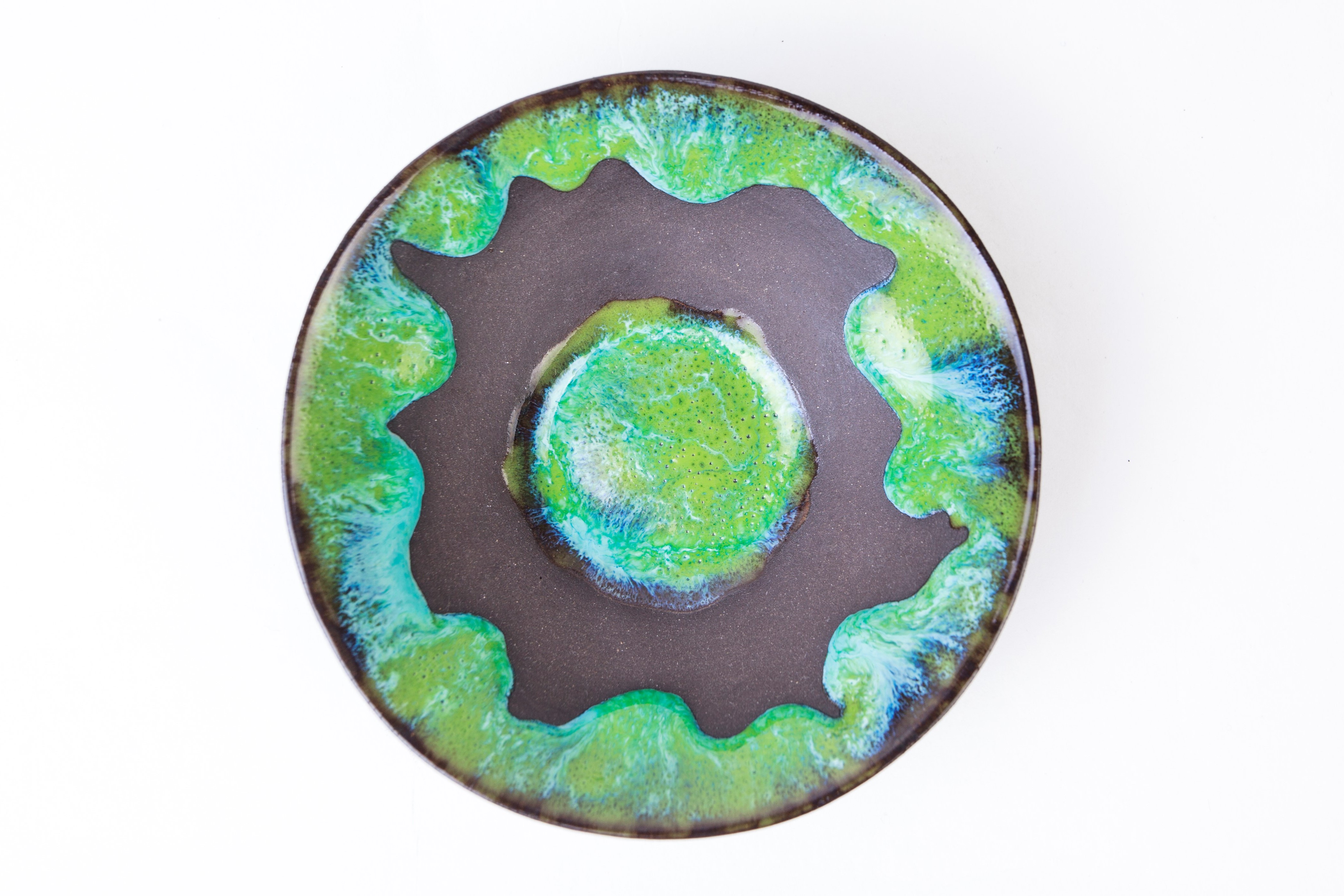 Эта пиала для чая — воплощение мастерства работы материалом — она очень тонкая и легкая, по толщине — меньше миллиметра, а по весу около 35г! Мы используем 3-4 глазури, чтобы создать уникальный цвет и до 3х обжигов, чтобы получить уникальный рисунок и красивые подтеки.
